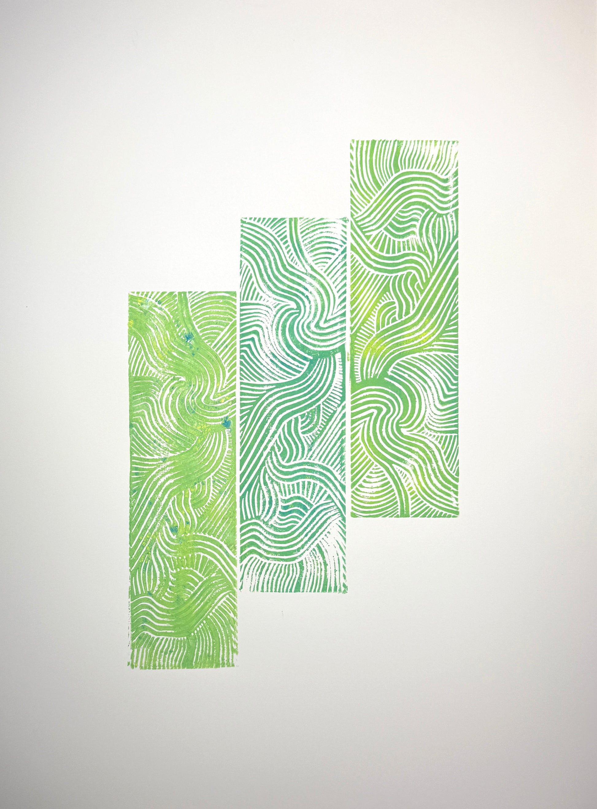 Linocut acrylic ink print ~12" x 16" on 18" x 24" watercolor paper.